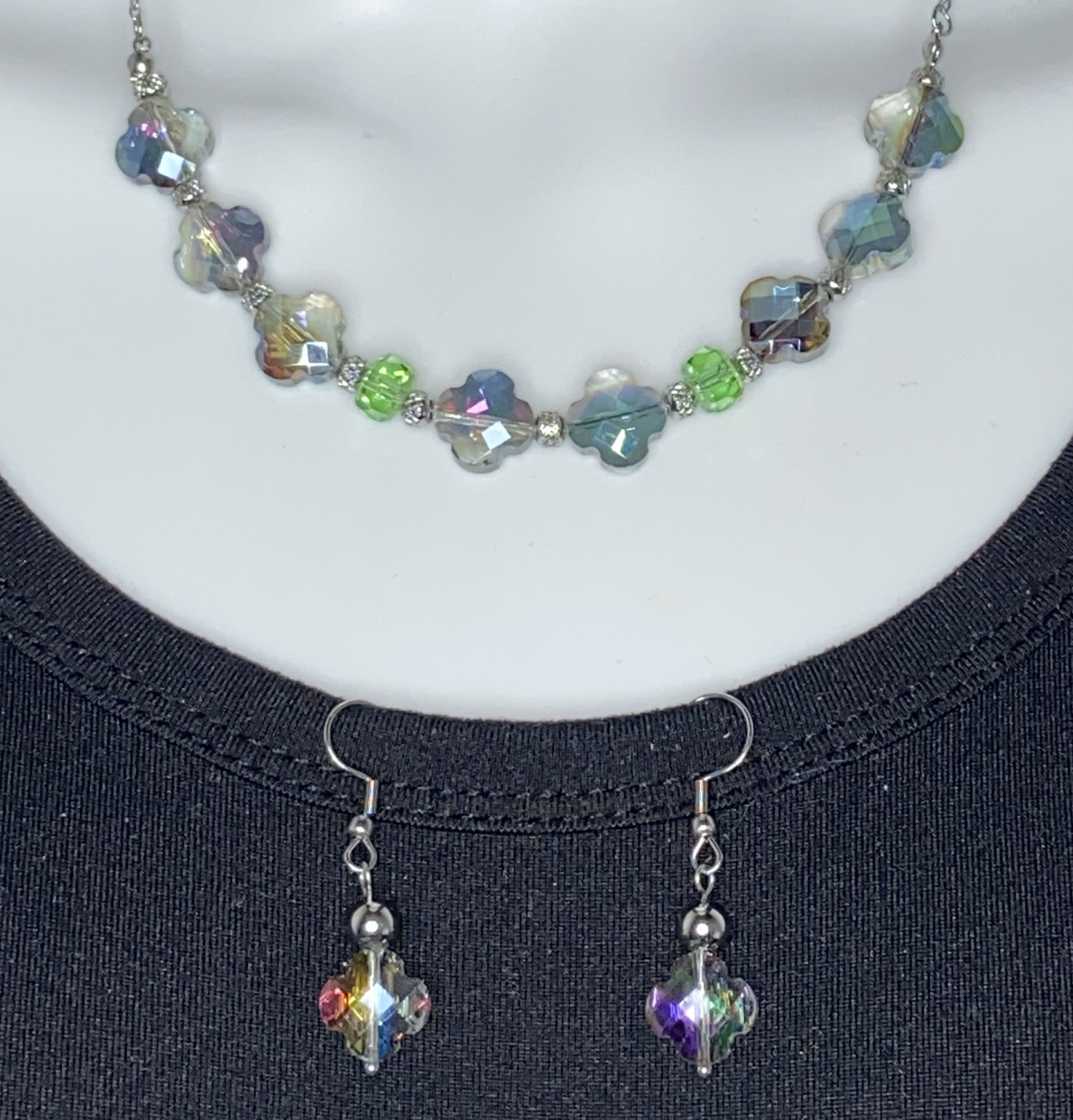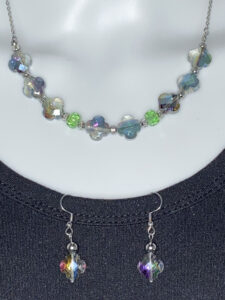 Elegant and full of charm, this newly designed 4-leaf clover beaded necklace set showcases luminous AB glass clover beads that catch the light with an iridescent shimmer, symbolizing luck and beauty. The coordinating earrings are thoughtfully crafted with stainless steel ear wires for durability and comfort, featuring a graceful 1 1/2″ drop that adds gentle movement and sparkle. Perfect for elevating everyday style or adding a meaningful touch to special occasions, this set blends timeless elegance with a hint of whimsical shine.