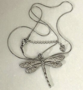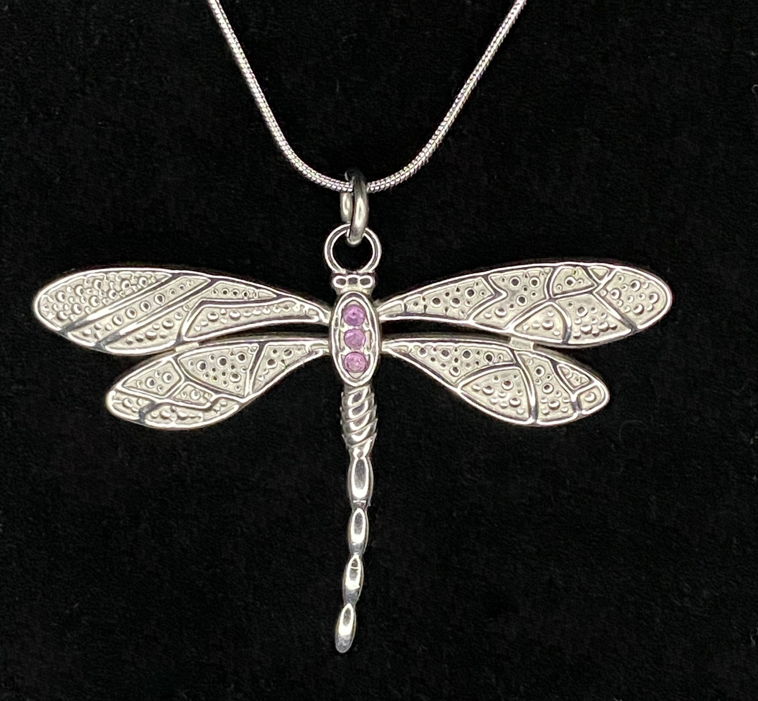 This lovely newly designed stainless steel dragonfly pendant features sparkling pink rhinestones set into a beautifully detailed design, adding a touch of elegance and charm. Suspended from a durable 19-inch chain with a secure lobster claw closure and a convenient 2-inch extension, this piece offers both style and versatility. The dragonfly pendant measures 2 inches long and 1 1/2 inches at its widest point, making it a standout accessory. Perfect for nature lovers or anyone seeking a delicate yet eye-catching statement piece.