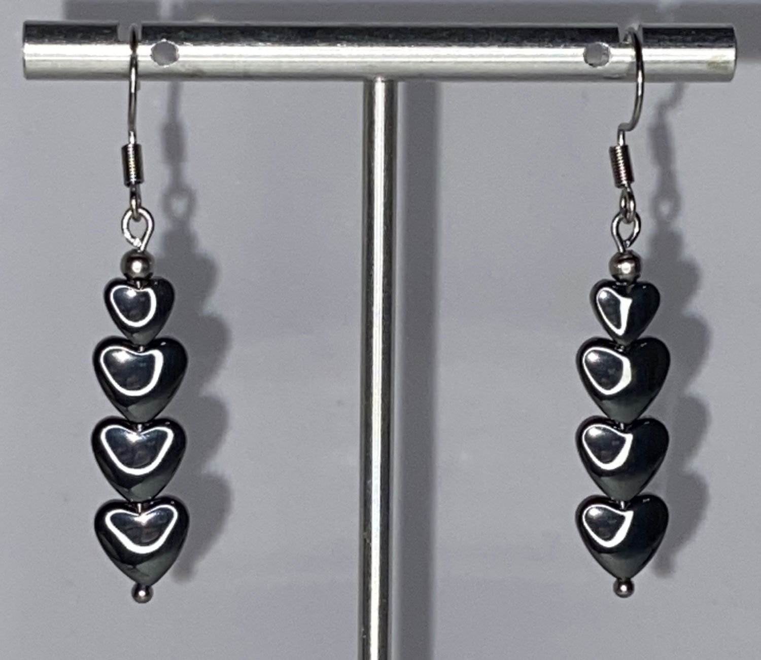 Each earring showcases a sleek hematite heart with an elegant 2″ drop length and 8mm width at the widest point, creating a minimalist yet meaningful design perfect for everyday wear or spiritual practice.