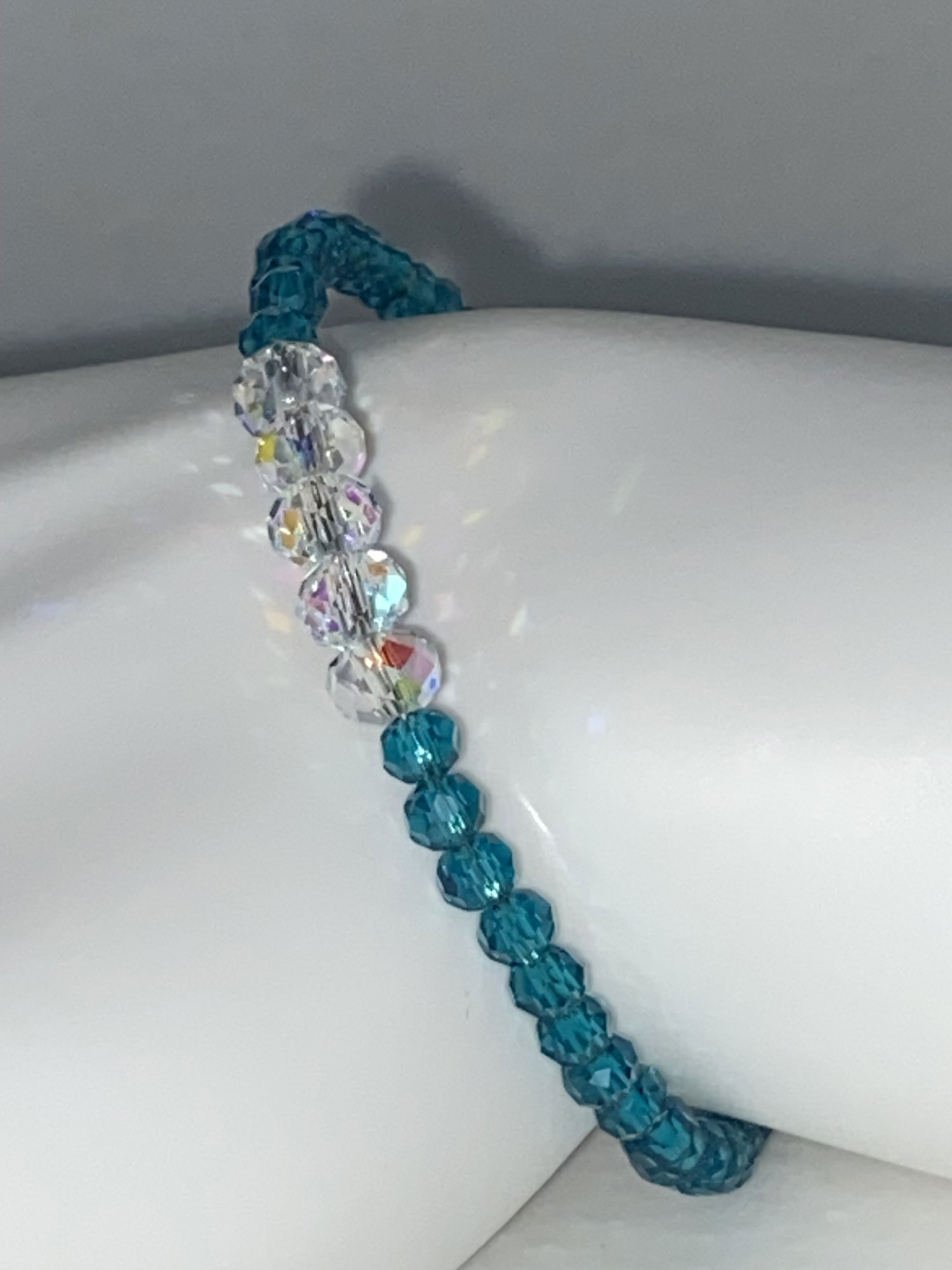 Make a statement with this stunning newly designed memory wire bracelet, expertly crafted to deliver bold, eye-catching sparkle with turquoise faceted glass beads and a dazzling focal centerpiece of large clear AB glass beads that add maximum bling and dimension. Designed on durable memory wire for a secure, flexible fit, this bracelet comfortably wraps the wrist in a stylish layered look, perfect for everyday wear or dressing up any outfit. Sized for S/M, it offers effortless wear, lasting shine, and standout style that elevates any jewelry collection.