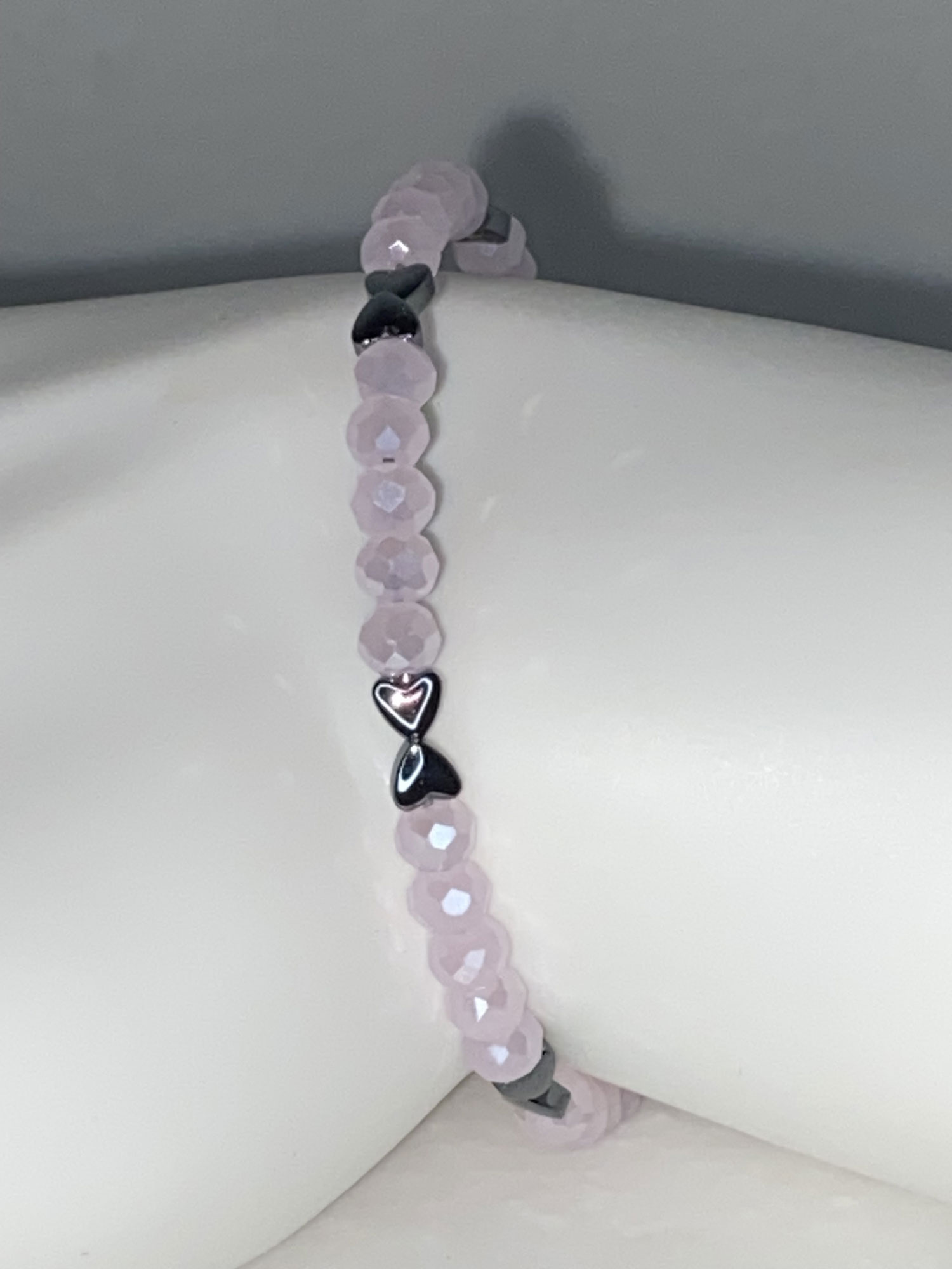 Embrace calm and clarity with this beautifully handcrafted healing bracelet, featuring charming hematite heart beads—known for promoting grounding, balance, and focus—paired with shimmering pink faceted crystal glass rondelle beads for a soft sparkle. Designed on durable stainless steel wire and finished with polished silver ball end beads for a clean, professional look, this elegant piece offers both style and intention. Sized to comfortably fit S/M wrists—perfect for everyday wear or meaningful gifting.