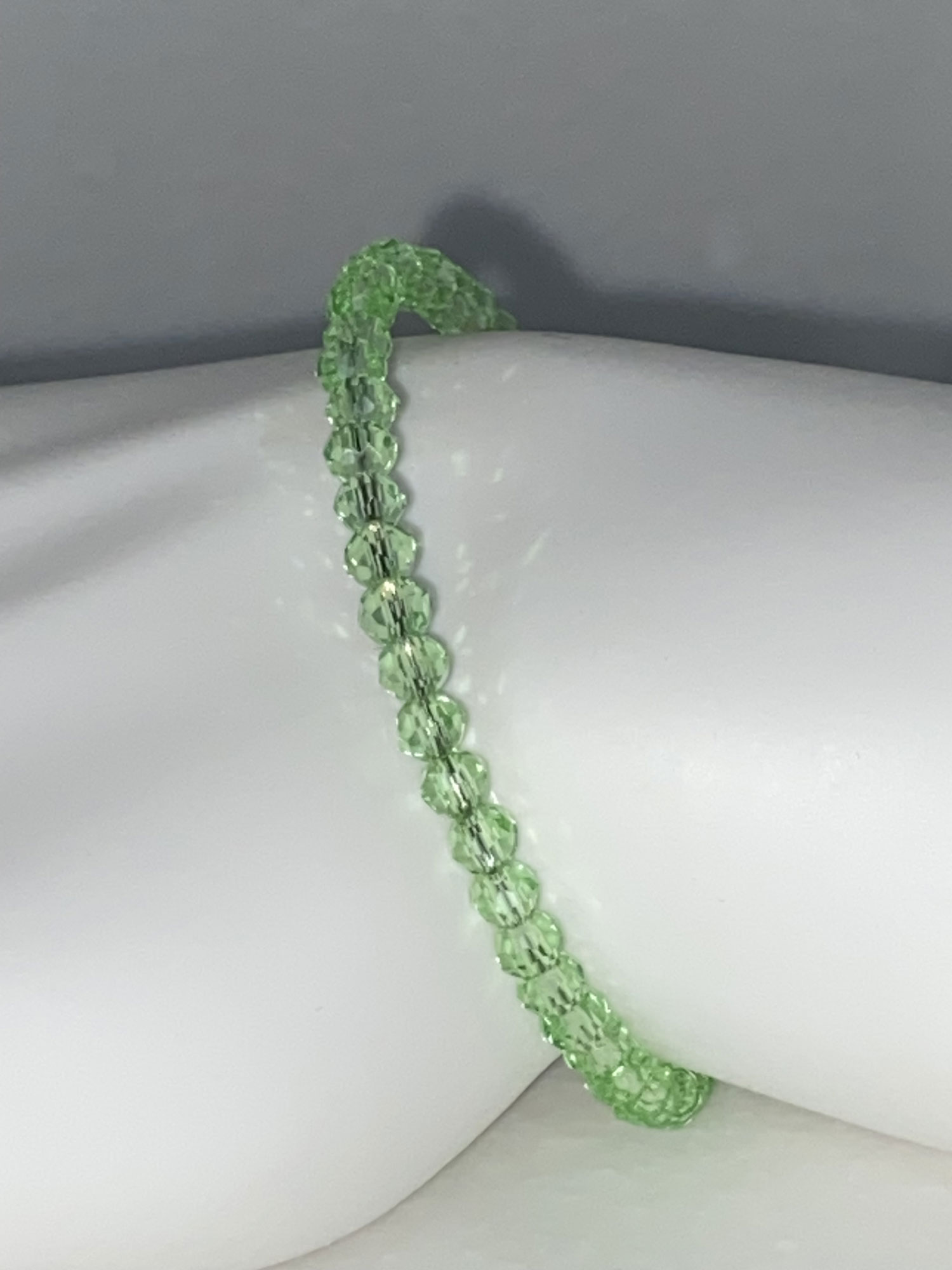 Striking and versatile, this beautifully handcrafted memory wire layering bracelet is designed with a dazzling array of 4mm light green faceted glass rondelle beads that catch the light with every movement, effortlessly wrapping the wrist in a comfortable, layered style without the need for clasps—perfect for wearing solo or stacked for a personalized, comfortable style. Available in S/M.