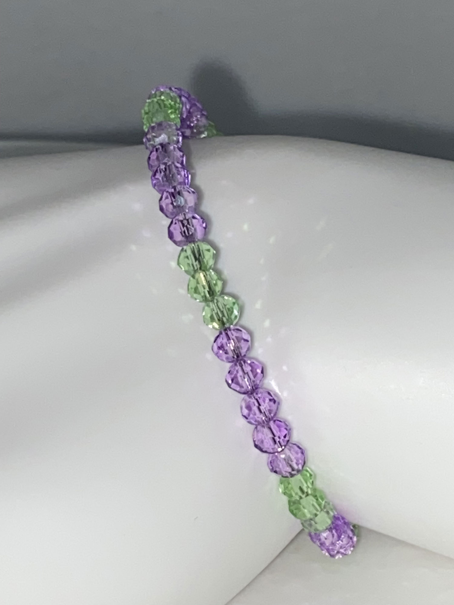 Striking and versatile, this beautifully handcrafted memory wire layering bracelet is designed with a dazzling array of 4mm light purple and green faceted glass rondelle beads that catch the light with every movement, effortlessly wrapping the wrist in a comfortable, layered style without the need for clasps—perfect for wearing solo or stacked for a personalized, comfortable style. Available in S/M.
