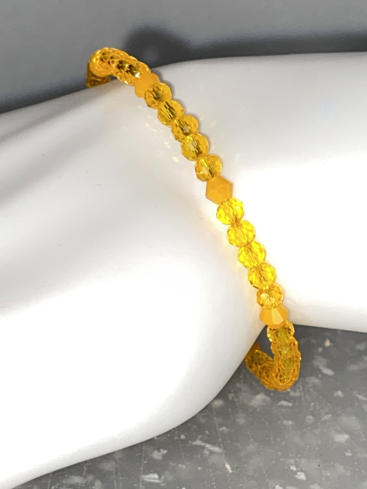 Striking and versatile, this beautifully handcrafted memory wire layering bracelet is designed with a dazzling array of 4mm orange faceted glass rondelle and bicone beads that catch the light with every movement, effortlessly wrapping the wrist in a comfortable, layered style without the need for clasps—perfect for wearing solo or stacked for a personalized, comfortable style. Available in S/M.