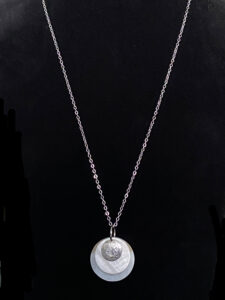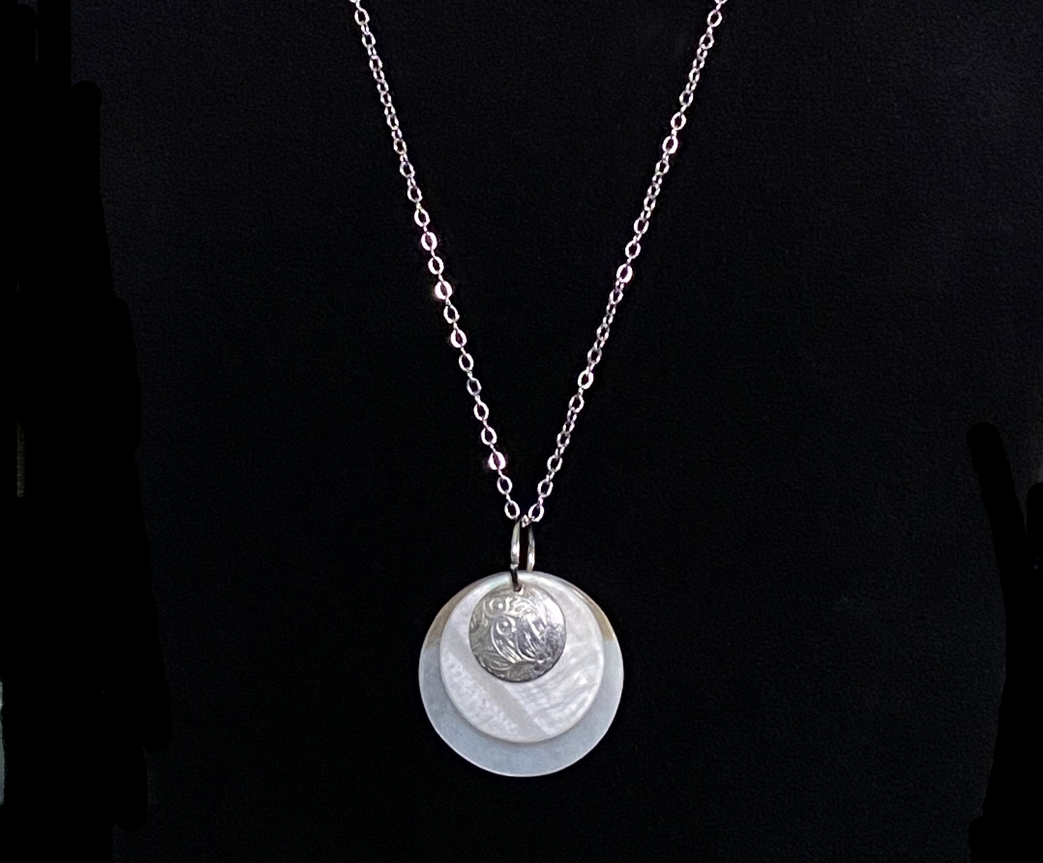 This newly designed necklace has upcycled Mother of Pearl layered disks accented with a silver floral etched disk. The pendant is 1″ at widest and is suspended from a new 20″ SS chain.