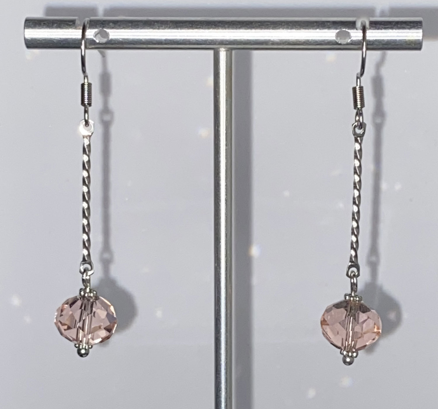 These newly designed earrings have pink faceted glass beads suspended from a stainless steel twisted bars & stainless steel French style ear wires. The drop is 2″ with 10mm pink faceted glass rondelle beads.