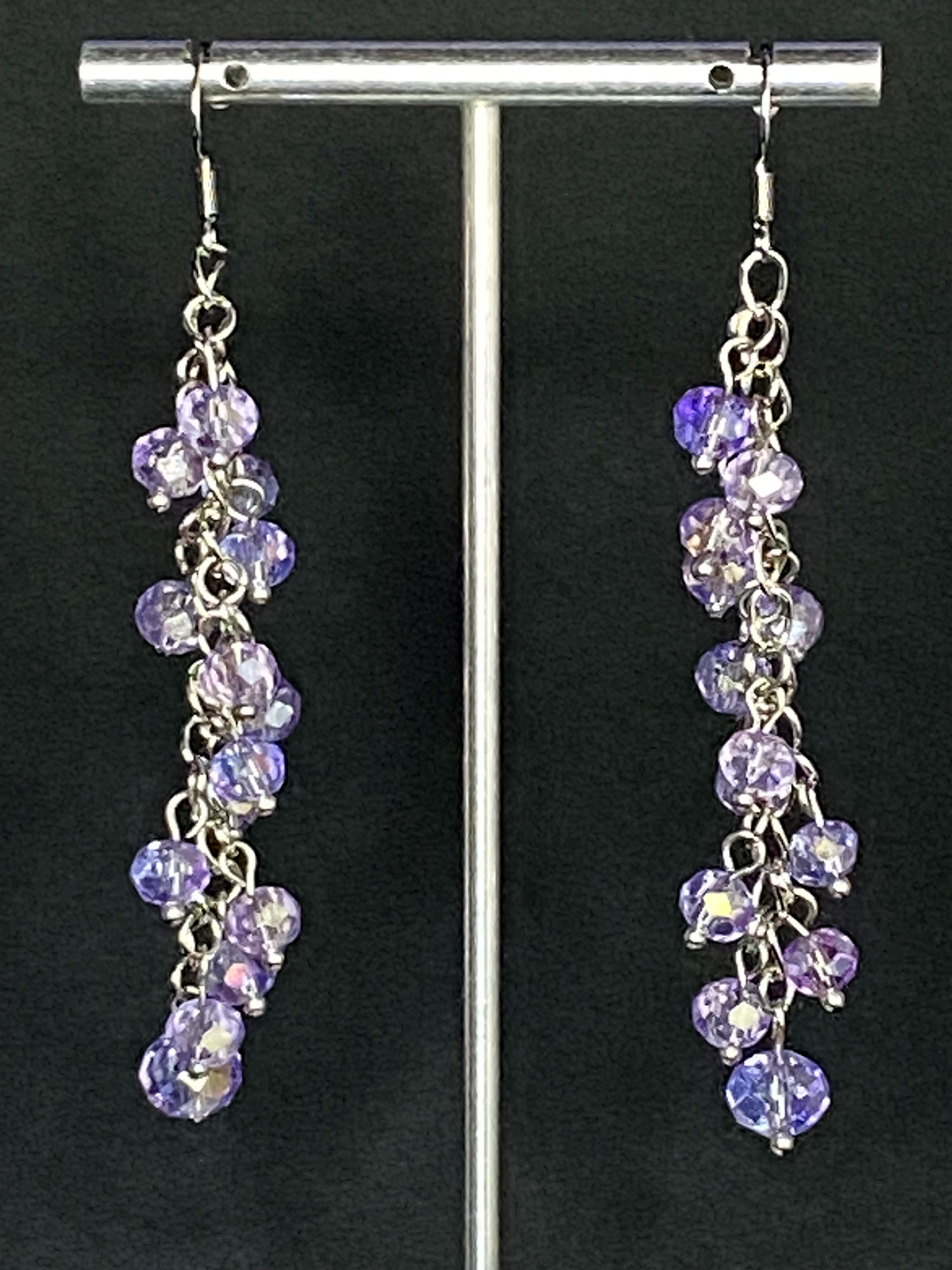 These amazing newly designed long light purple faceted AB Czech glass beaded drop earrings have a 3″ drop & all stainless steel findings & ear wires.