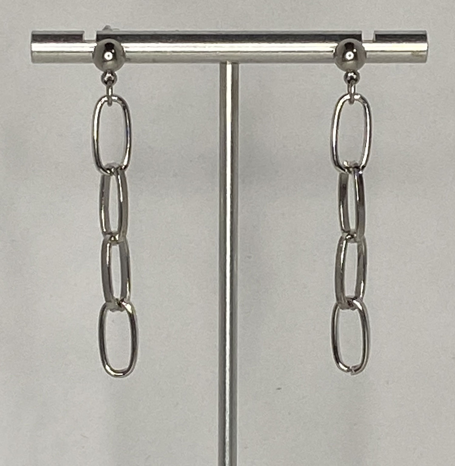 These lovely newly designed earrings are designed with upcycled rhodium plated paper clip chain & new stainless steel ball post ear wires. Drop is 2″.