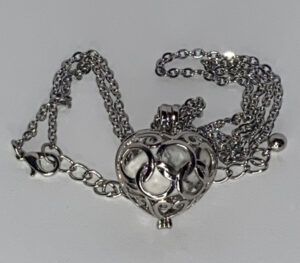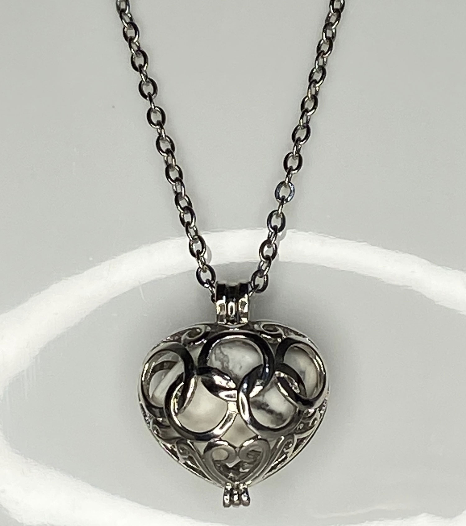 This beautiful rhodium plated open-work puff heart cage pendant features a tumbled howlite crystal stone inside, known for its calming and soothing energy. Howlite is often associated with stress relief, better sleep, emotional balance, and self-healing, making this necklace both a meaningful accessory and a gentle wellness reminder.