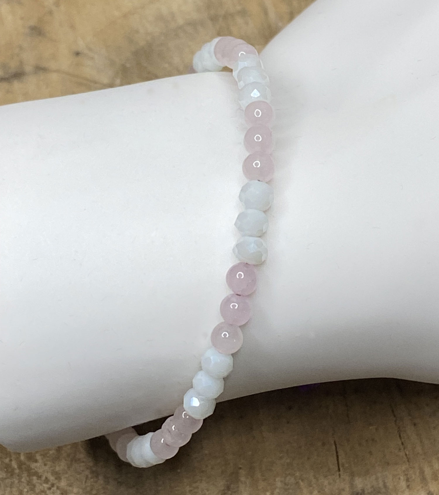 This lovely memory wire layering healing bracelet is designed with 4mm round rose quartz beads & 4mm faceted opaque white glass beads. Rose quartz is known for bringing more love, calm & balance into your life. This bracelet may be worn alone or with your other bracelets. Size is S/M,