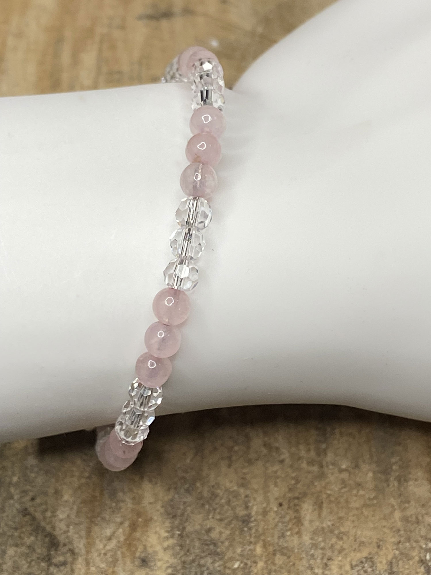 This newly designed memory wire layering healing bracelet is designed with 4mm round rose quartz beads and accented with 4mm clear faceted glass beads. Rose quartz is known for bringing more love, calm & balance into your life. This bracelet may be worn alone or with your other bracelets. The size is S/M.