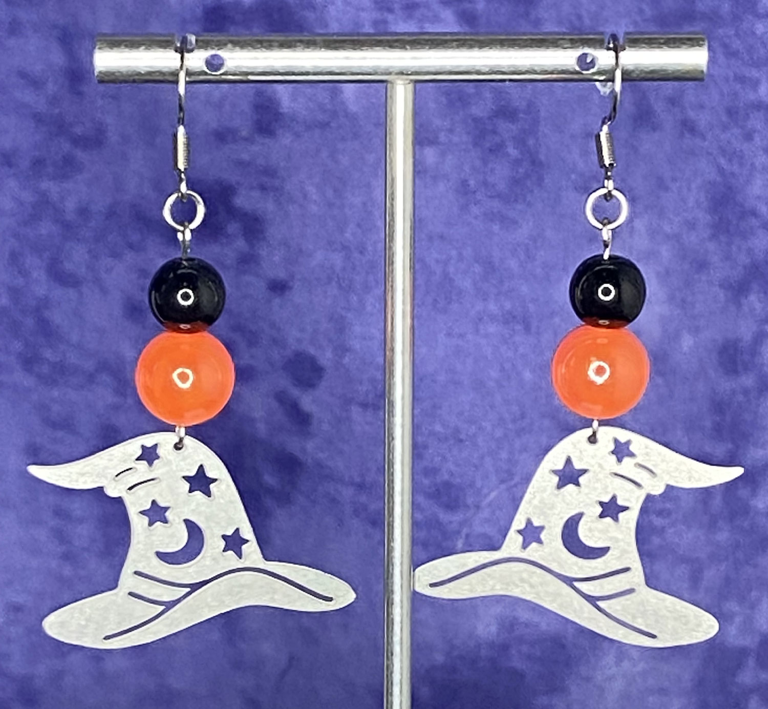 These newly designed Halloween theme earrings have acrylic black & orange beads with a SS witches hat suspended from hypoallergenic ear wires. Drop is 2 1/2″ and 1 1/4″ at widest.