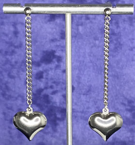 These newly designed stainless steel puff heart & ball post earrings are lightweight, have a drop of 2 1/2″ & heart is 3/4″ X 3/4″.