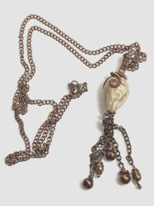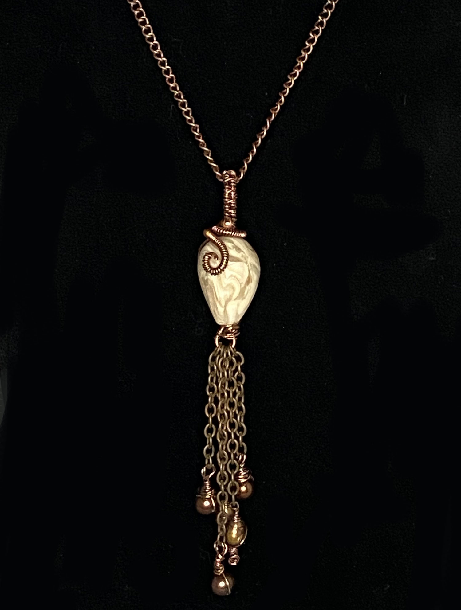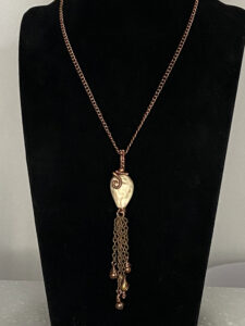 This stunning artisan antique copper pendant necklace features a beautifully upcycled, hand-wrapped matte crazy lace agate “healing” stone (joy, optimism, mental agility) accented with an elegant chain tassel for added movement and style. Suspended from a new 28″ antique copper chain with a secure lobster clasp, this unique statement piece blends earthy tones with vintage-inspired charm. The total pendant length, including bale and tassel, measures 4″, making it a bold yet wearable accessory perfect for layering or wearing on its own.
