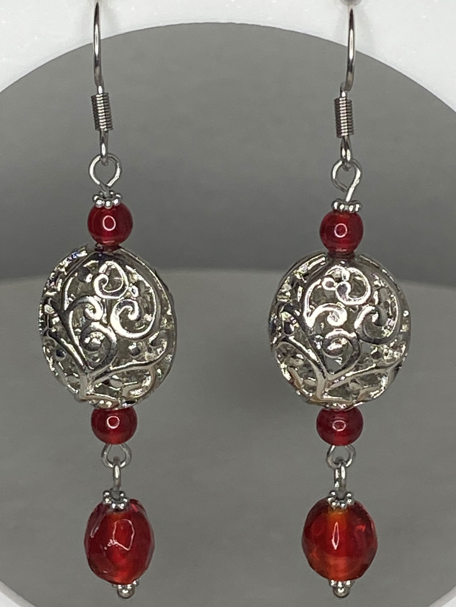 Make a statement with these bold, earrings featuring upcycled oversized rhodium-plated filigree beads accented by vibrant handmade red glass beads. Designed to stand out, these striking drop earrings measure 2.5 inches long and 14mm at widest—perfect for adding dramatic flair and sustainable style to any look.