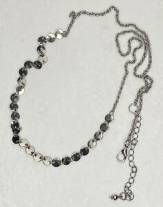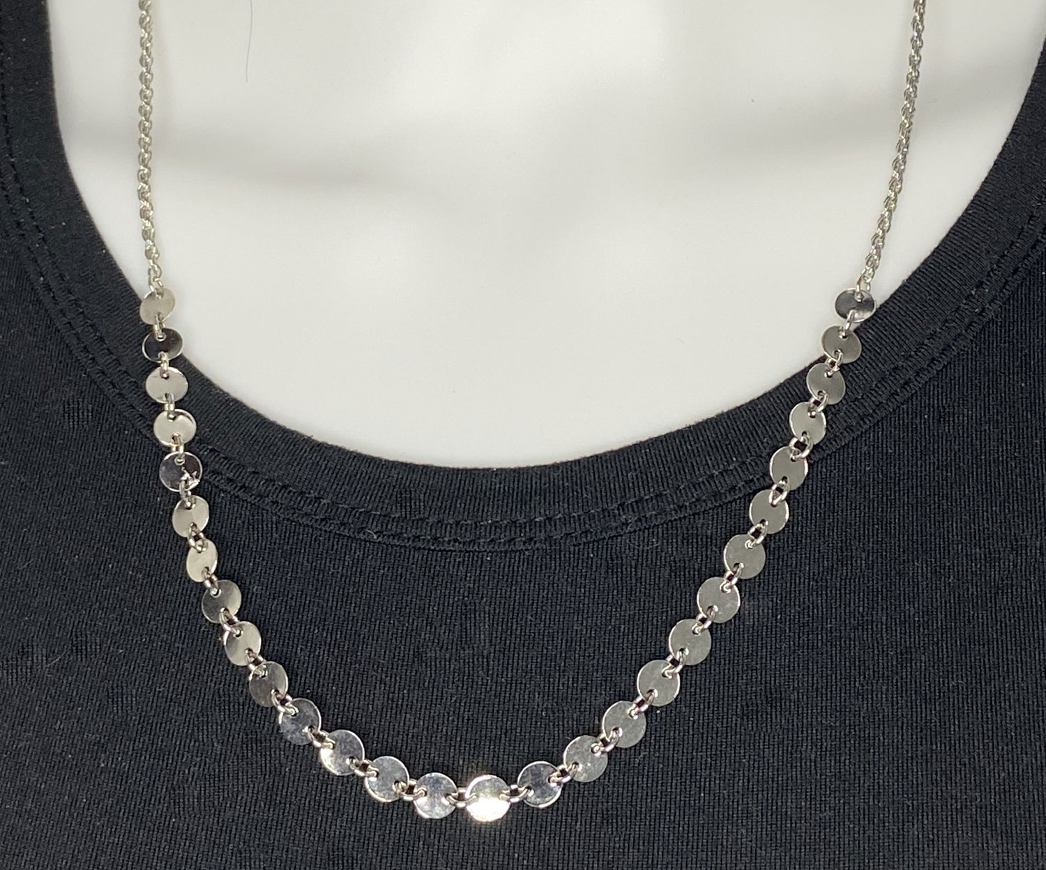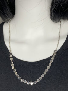 Stunning 22″ silver tone upcycled disk chain necklace, designed for effortless layering, adding sparkling shine and modern elegance to any outfit, perfect for stacking with your favourite necklaces or wearing solo for a bold statement. See SKU# 6P-047-160426 for a longer 24″ version.