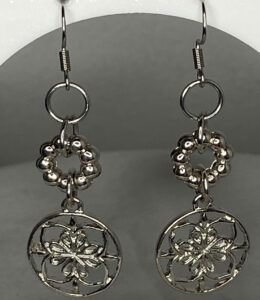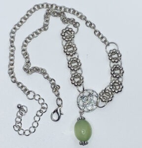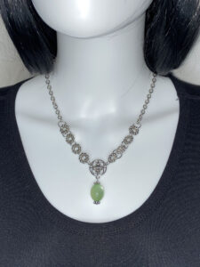 Make a statement with this 17″ upcycled silver-tone necklace (3″ extension!). Featuring oversized daisy spacers, chunky circle links, a playful floral charm, and a striking green glass cat’s eye bead pendant—vintage-inspired flair with modern boldness! Pendant is 1 7/8″ long. Set includes matching earrings with 2 1/4″ drop.