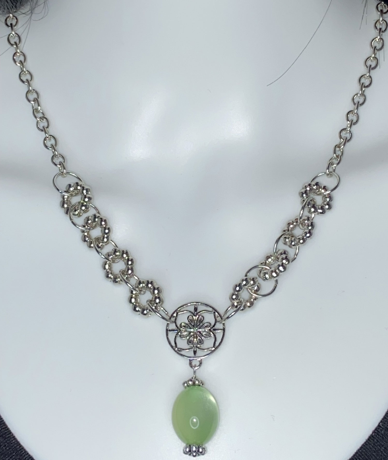 Bold Upcycled Silver-Tone Necklace – Green Cat’s Eye Pendant