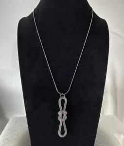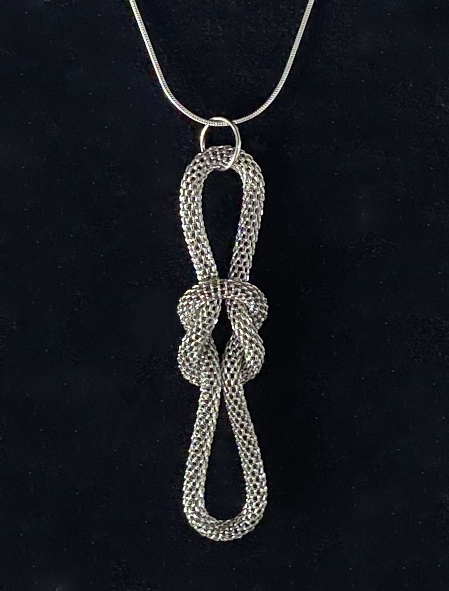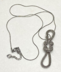 Elevate your look with this beautifully newly designed pendant, featuring silver-tone mesh artfully shaped into an intricate knotted pattern for a modern yet timeless appeal. The textured mesh adds depth and dimension, catching the light for a subtle, sophisticated shimmer. Suspended from a durable 19″ stainless steel chain with a 2″ extension, this piece offers both strength and versatility, allowing you to adjust the length for the perfect fit. Ideal for layering or wearing on its own as a statement piece, this pendant transitions effortlessly from everyday wear to special occasions, making it a stylish and versatile addition to any jewelry collection.