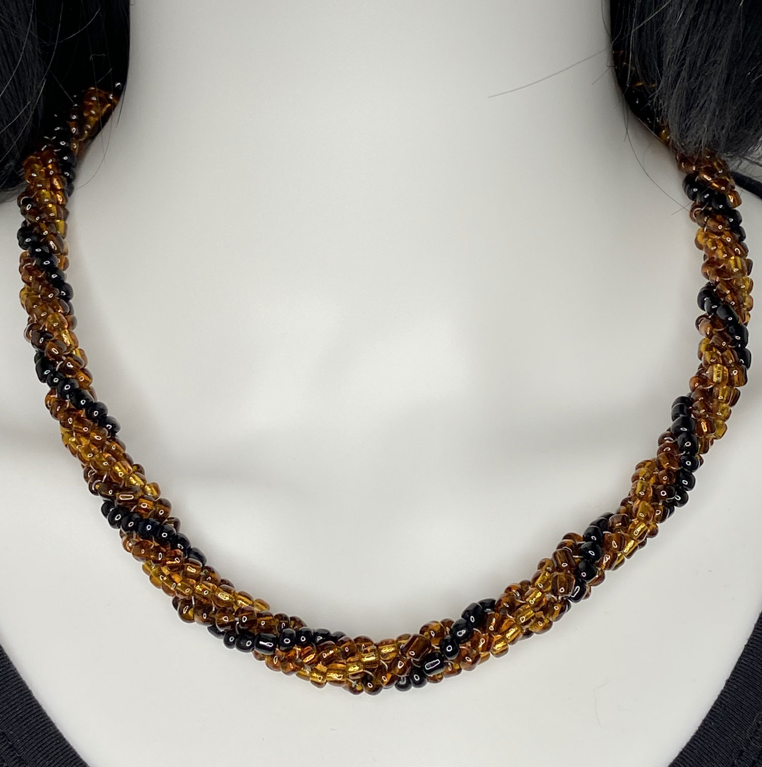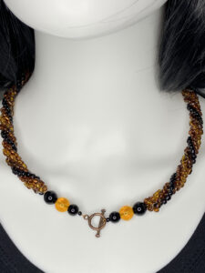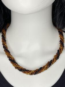 This beautiful well constructed pre-loved seed 18″ torsade (twisted necklace) has black, brown & gold Czech glass seed beads, black onyx & gold glass beads with a copper toggle clasp. This necklace can be worn with the toggle clasp in front for a more modern look or in back as the classic look.