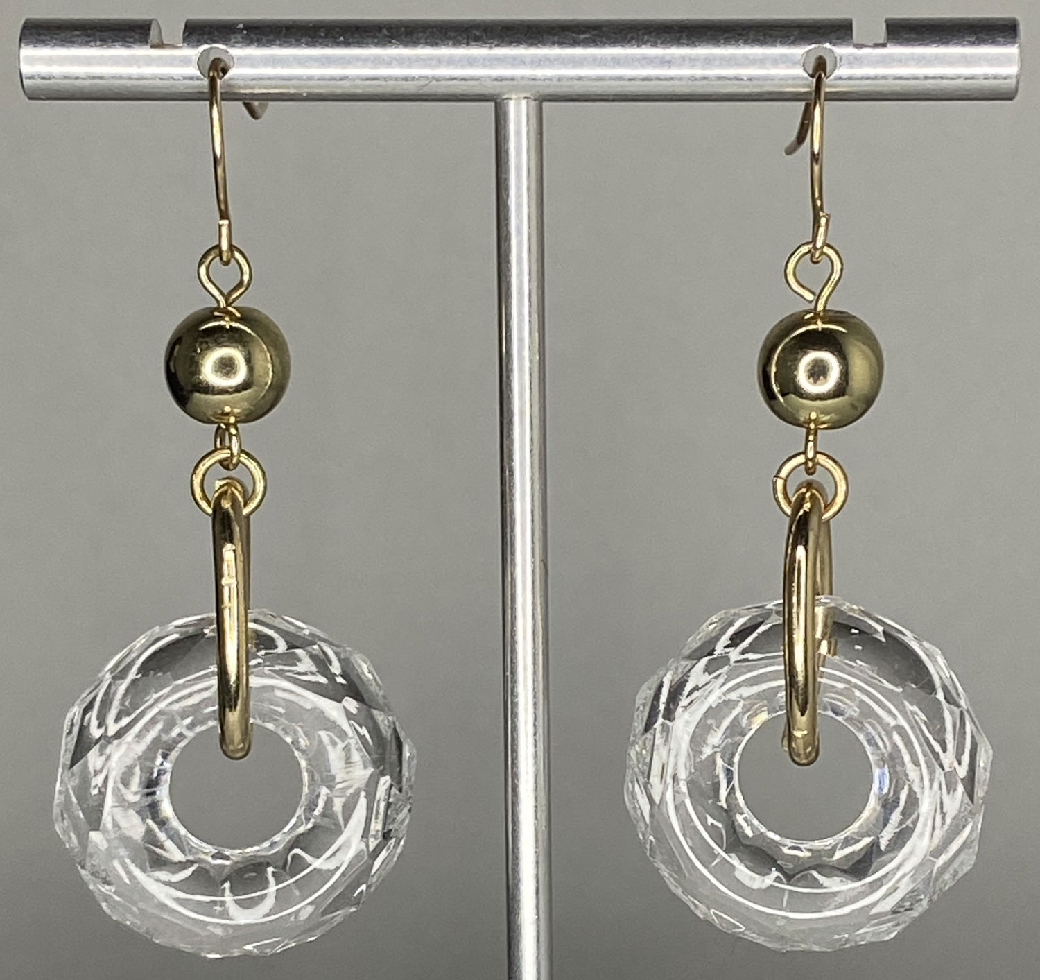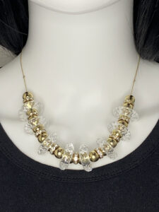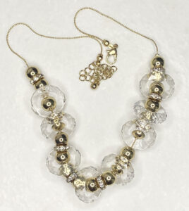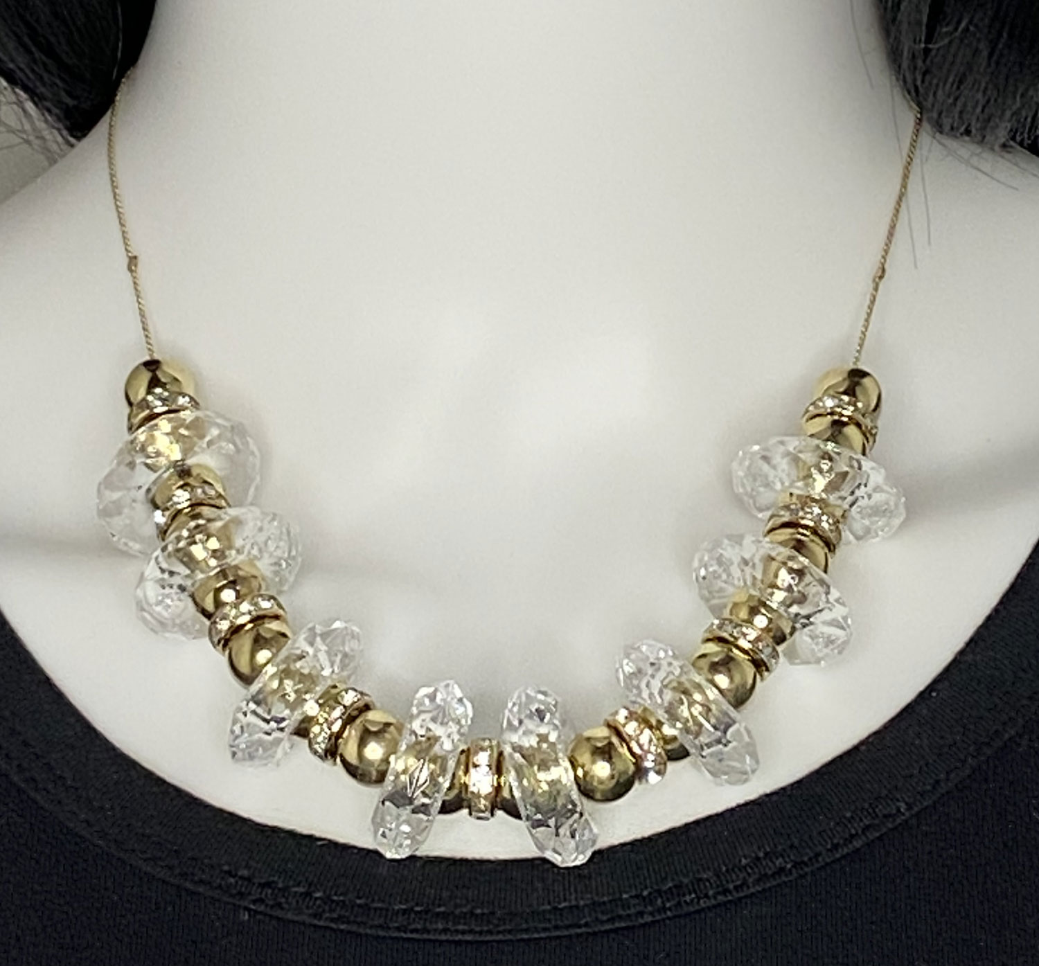 Make a bold impression with this spectacular pre-loved gold tone statement necklace, featuring eye-catching clear Lucite 7/8″ wheel beads beautifully accented with shimmering gold tone and rhinestone spacers. Measuring 17″ with a 3″ extension for versatile styling, this stunning piece is finished with a secure lobster clasp—perfect for adding vintage-inspired glamour and radiant sparkle to any outfit. Matching earrings have a 2″ drop and gold plated stainless steel French ear wires.