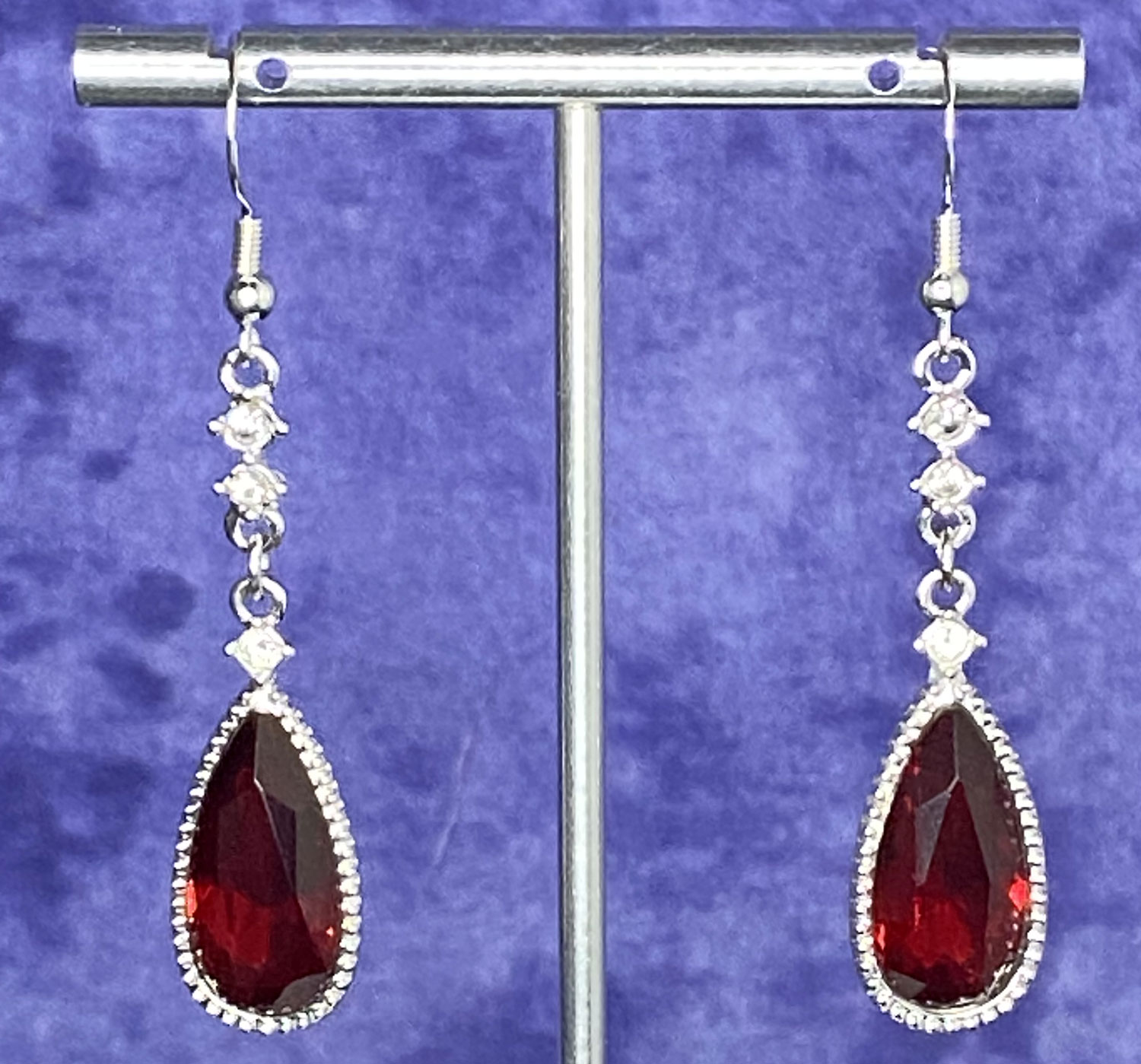 These beautiful pre-owned rhodium plated medium length earrings have a large red faceted faux crystal & 3 zirconia’s. The drop is 2 1/2″ & 1″ at the widest. Ear wires have been replaced with new rhodium plated ones. There is slight scuffing on red stones & is reflected in price.