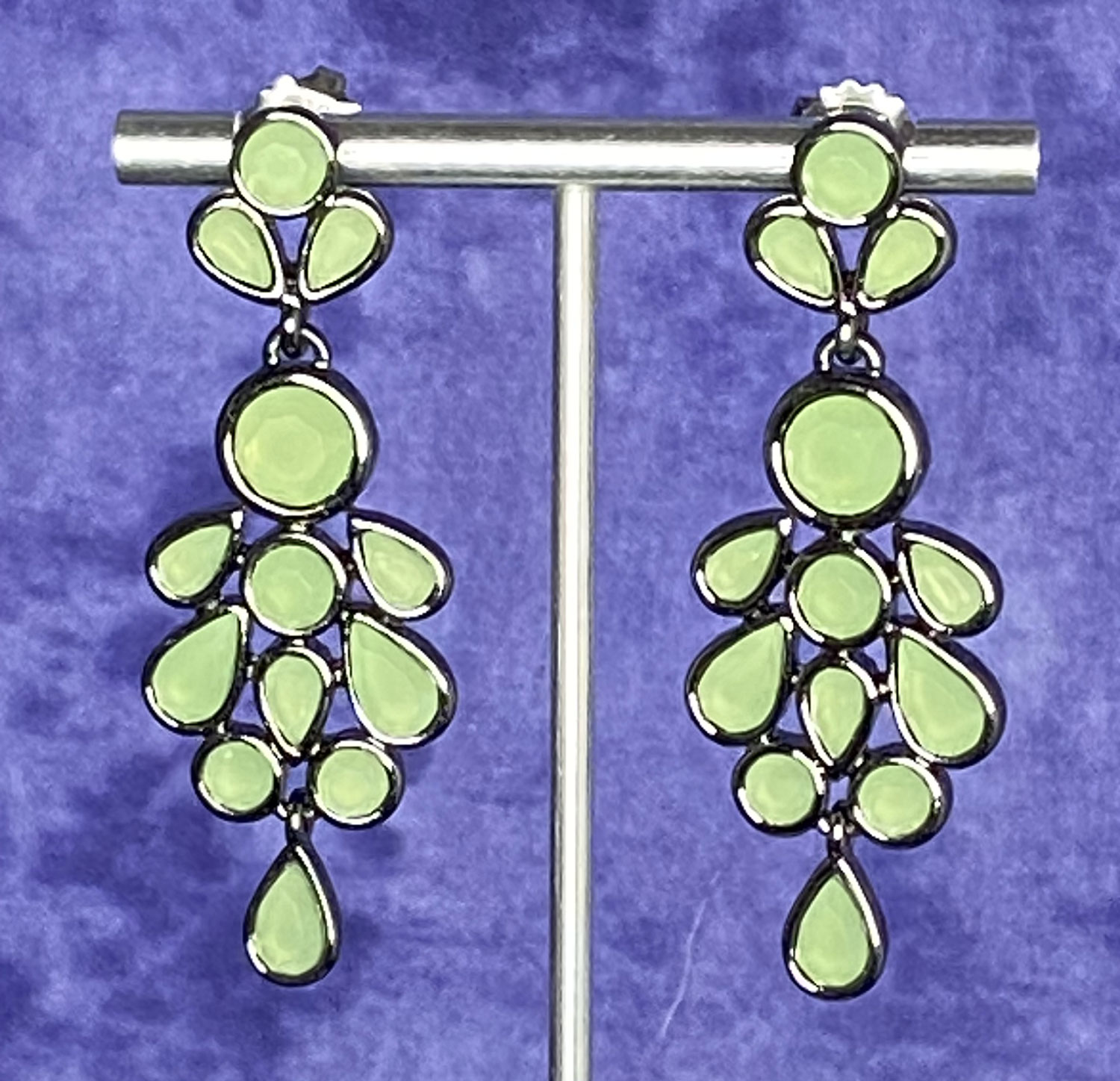 These beautiful like new Lia Sophia “Slow Dance” earrings have glacial mint resin stones set in hematite tone metal. They have a 2 1/4″ drop and 3/4″ at widest.
