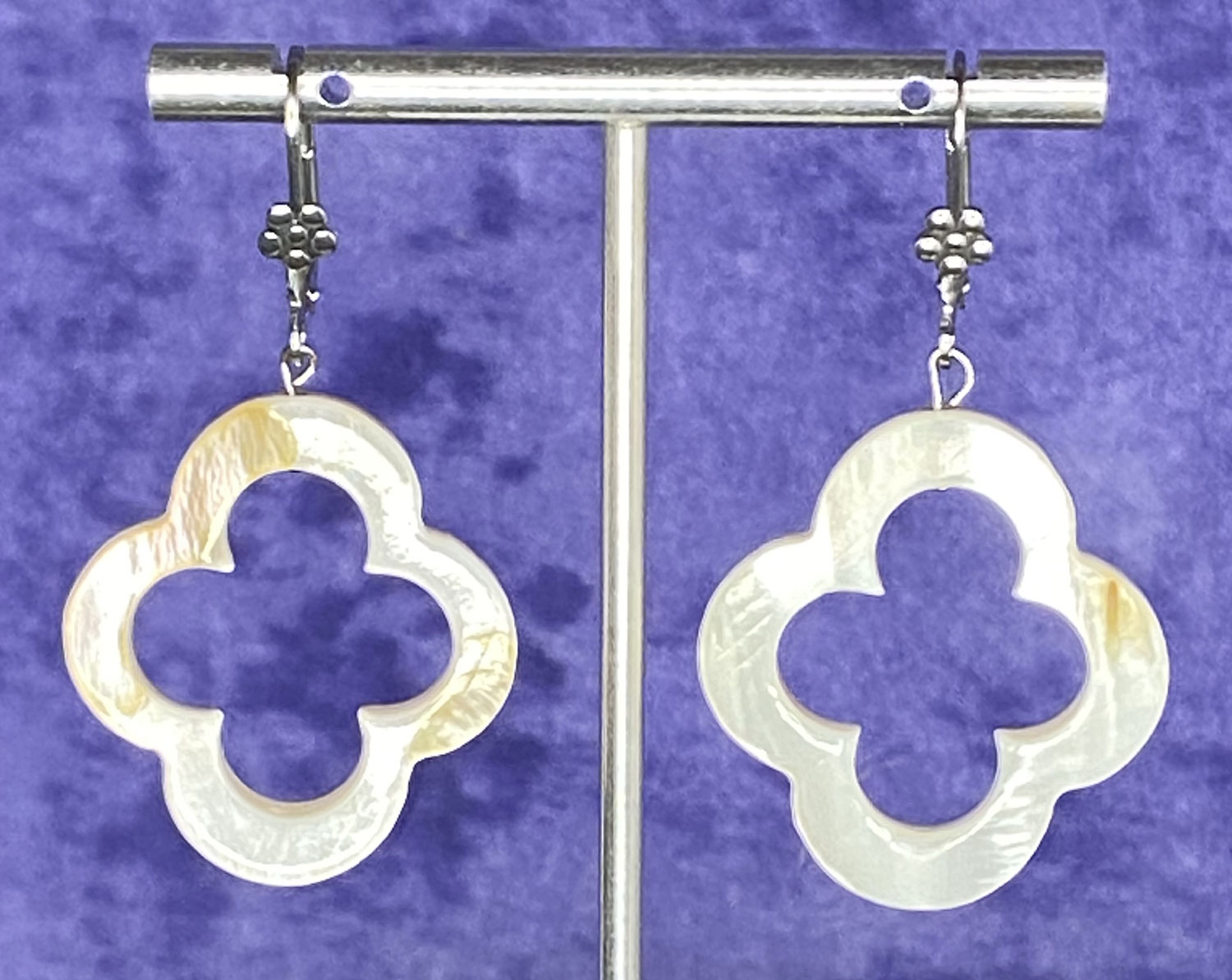 These cute pre-loved quatrefoil Mother of Pearl earrings are lightweight and showcase the shell’s unique characteristics. The have a 2″ drop and are 1 1/4″ at widest.