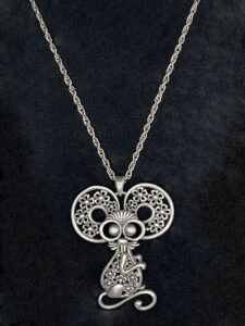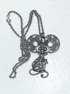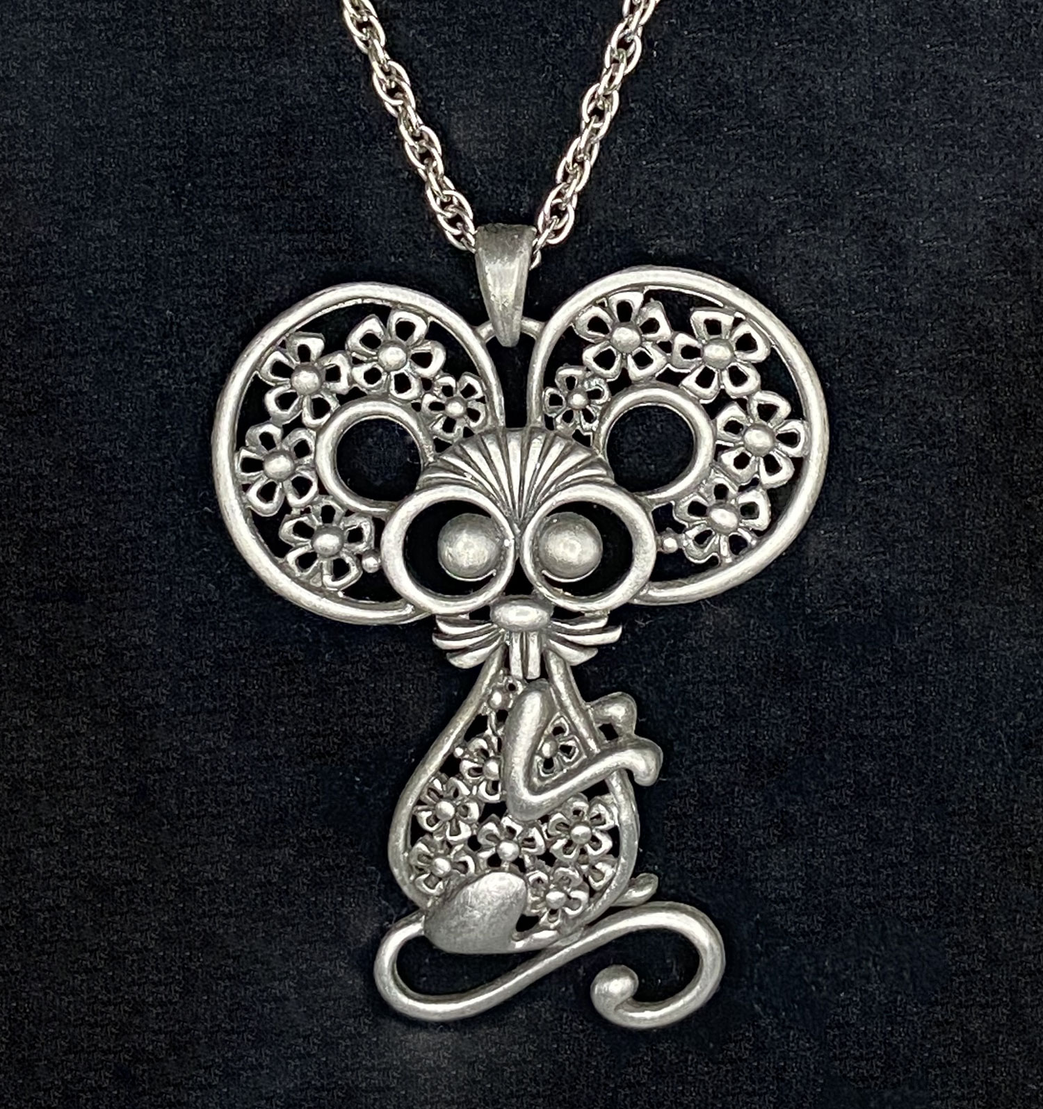 This charming pre-loved articulated pewter mouse pendant features whimsical detail and movable segments, adding playful character to any outfit. It hangs from a 24″ silver-tone chain with a secure ring clasp, making it a unique and eye-catching accessory for animal lovers and collectors alike. Pendant is 3″ long and 2″ at widest.