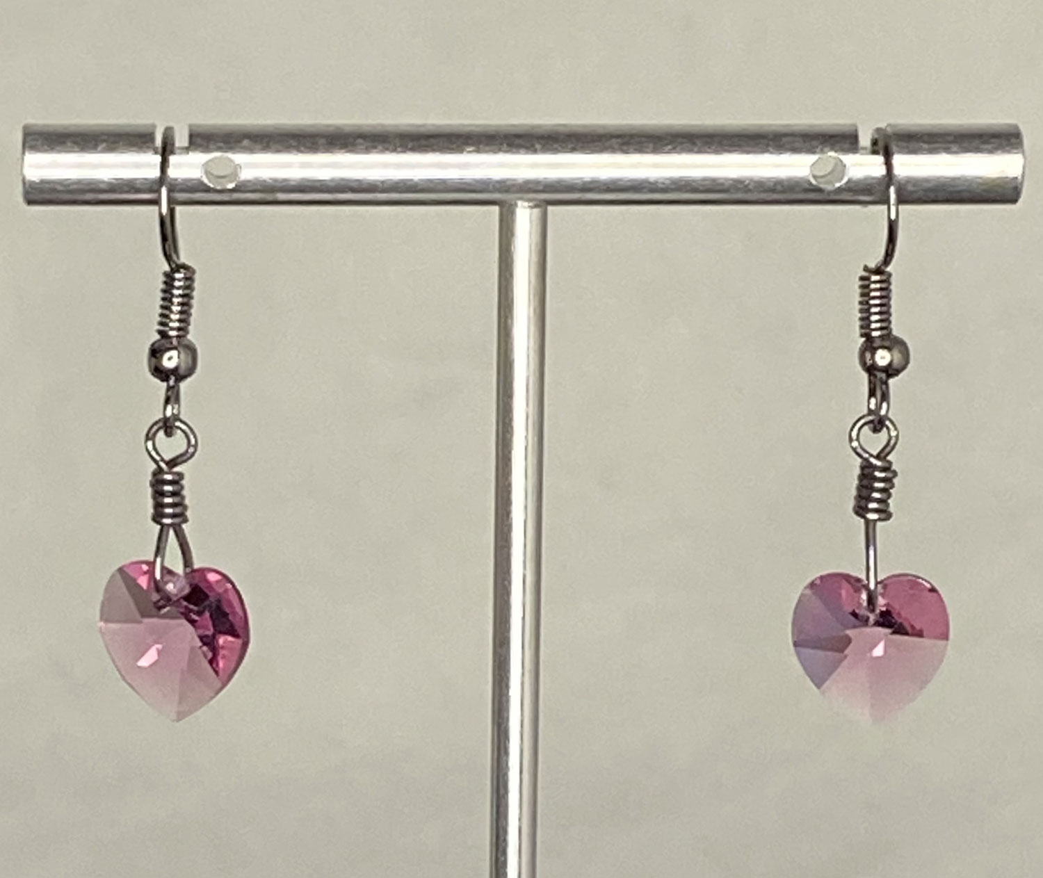 Pre-loved elegant pink sparkling Swarovski AB faceted crystal earrings. 1 1/2″ drop 3/8″ wide. These are in good condition with very slight wear on edge of crystals with replacement stainless steel ear wires. A perfect gift for any special occasion!