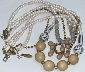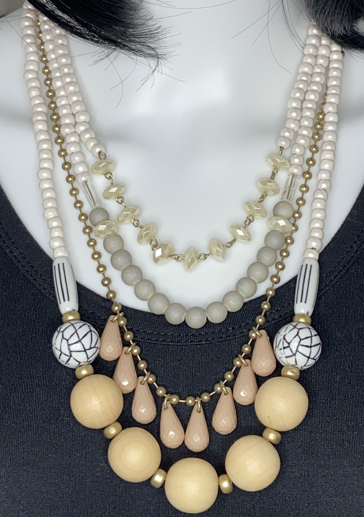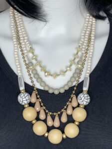 Bold and eye-catching, this pre-loved Plunder statement necklace features four layered strands (20″–25″) adorned with an eclectic mix of beads, highlighted by a striking black and white veined focal bead with minor wear—reflected in the price—and finished with a 3″ extension for adjustable styling.