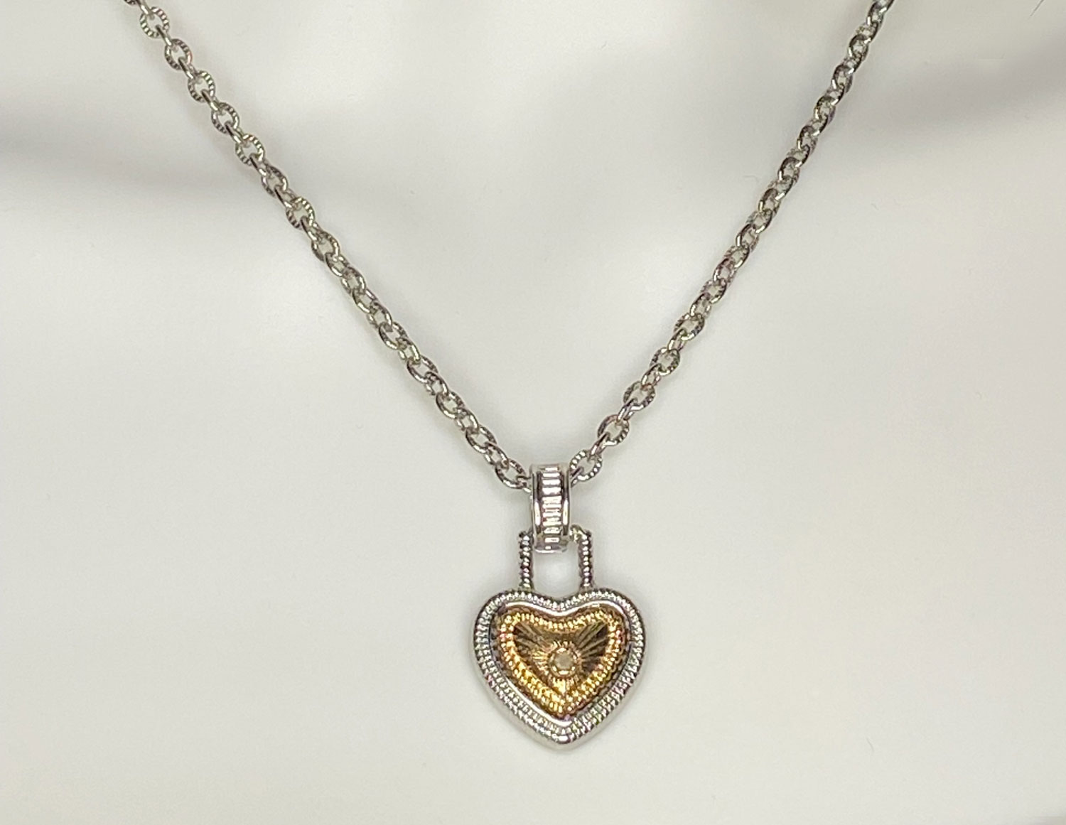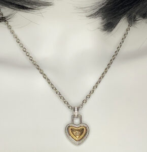 This pre-loved rhodium plated heart with a real diamond chip in mixed metals has a silver tone 19″ chain. The heart measures 5/8″ at widest and there is slight scuffing on back which is reflected in price.