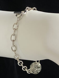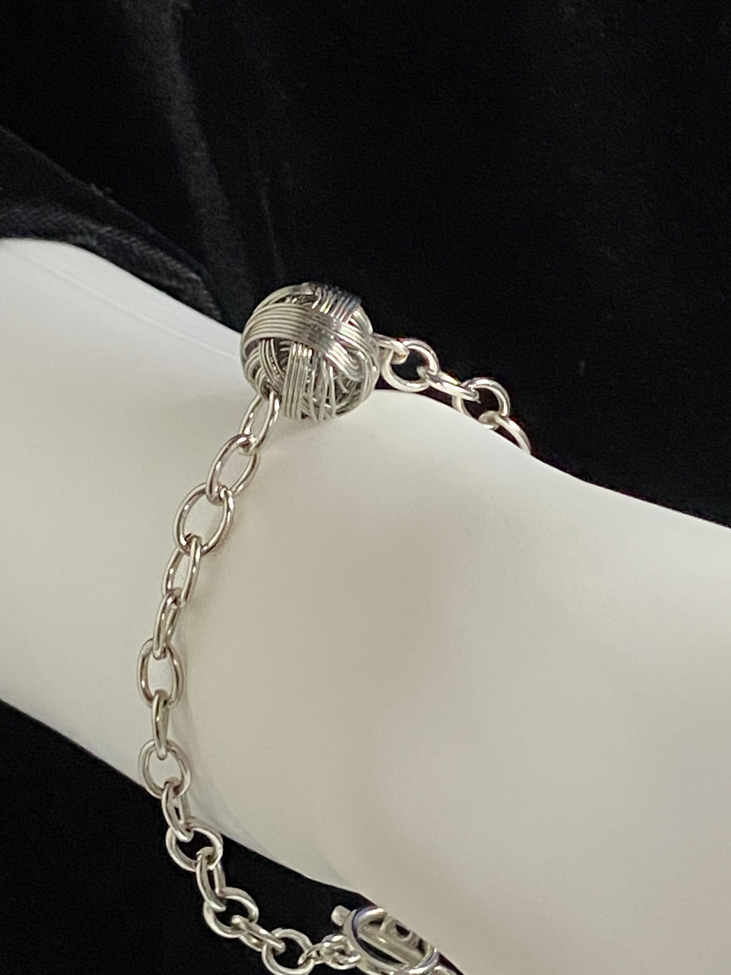 This lovely simple chain bracelet is rhodium plated with a single love knot pendant & a toggle clasp. It measures 7″ on a bracelet mandrel.