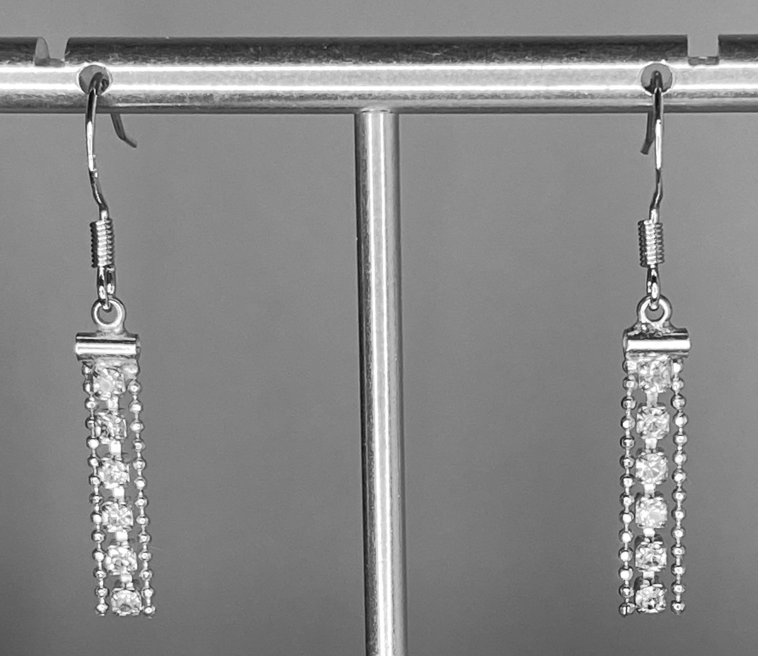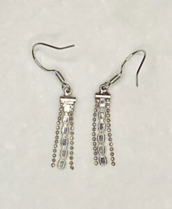 Make a statement with these stunning pre-loved silver chain earrings, sparkling with brilliant rhinestones and thoughtfully updated with new 925 sterling silver ear wires for comfort and durability; with a graceful 1 1/2″ drop and a refined 5mm width, they add a touch of glamour and sophistication to any outfit, perfect for both everyday wear and special occasions.