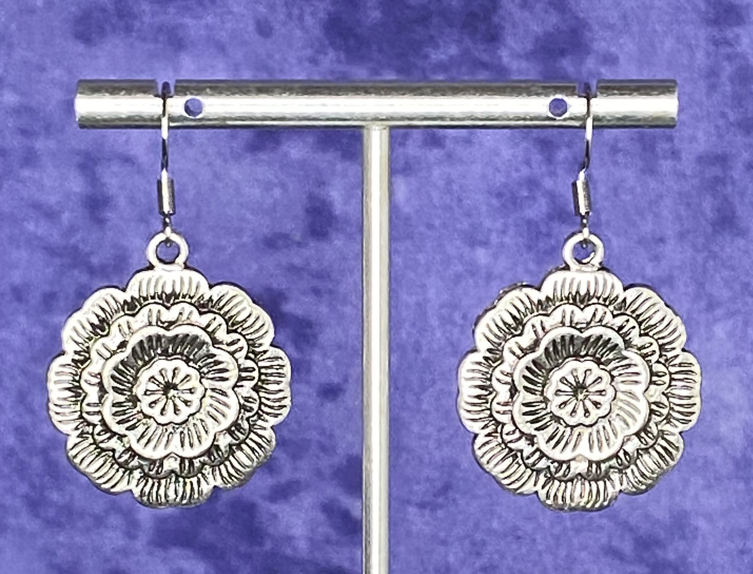 These lovely pre-owned solid silver chased floral earrings have stainless steel hypoallergenic ear wires, a 1 3/4″ drop and  1″ at widest.