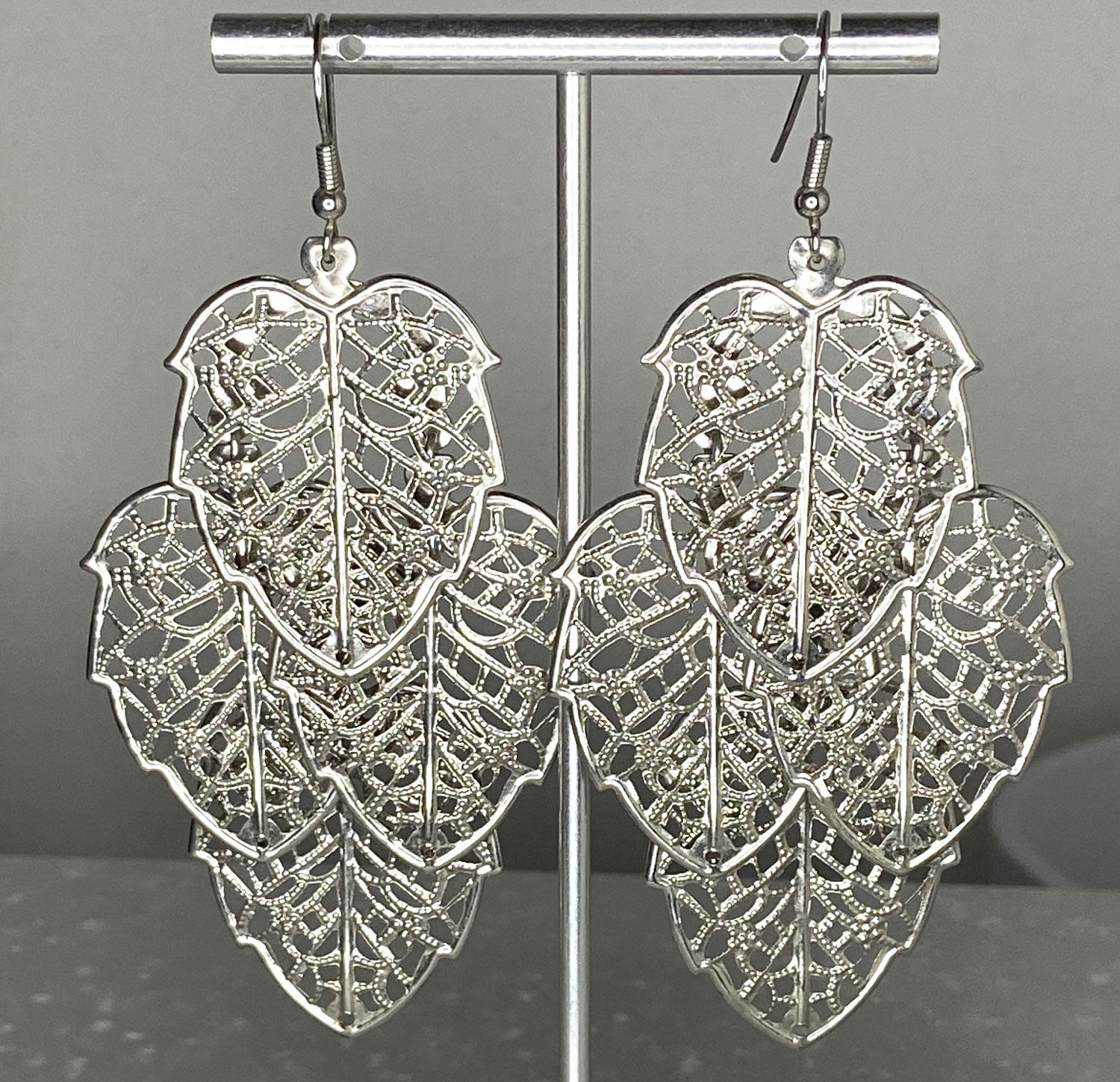 Make a bold statement with these eye-catching pre-loved silver tone filigree leaf dangle earrings, featuring an intricate openwork design that adds elegant texture and movement. With an impressive 3 3/4″ drop and a generous 2″ width, these lightweight statement earrings are perfect for elevating both casual and dressy looks. Ear wires have been replaced with new hypoallergenic stainless steel ear wires.