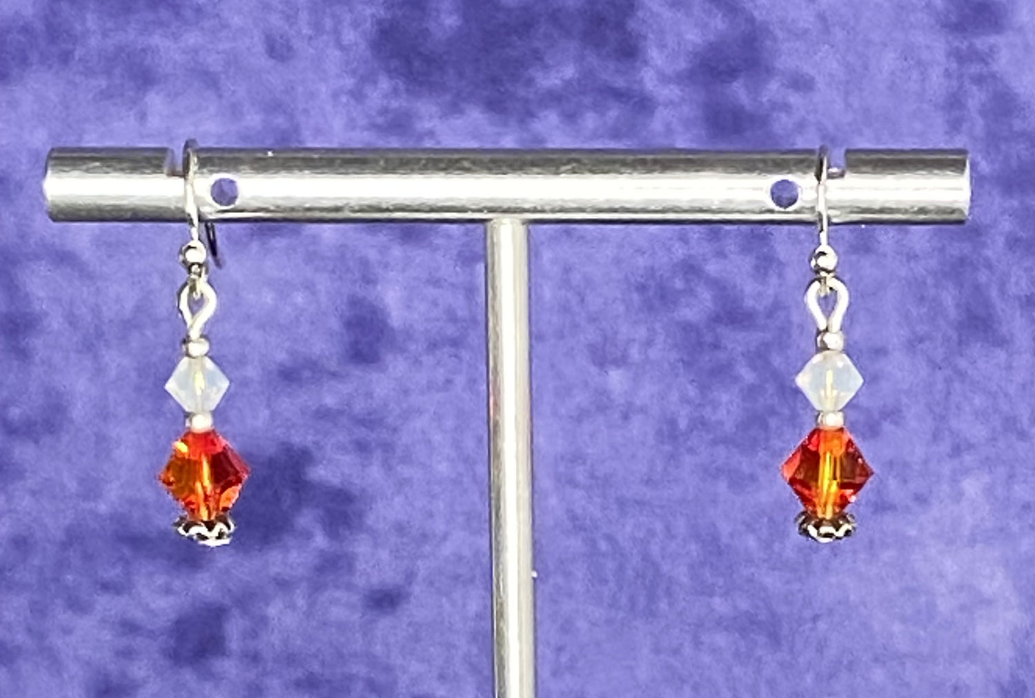 These pre-loved silver earrings have 2 faceted bicone beads in orange & semi-opaque white. The drop is 1 1/4″ with 6mm at widest. The silver ear wires have been sterilize, price is reflective.