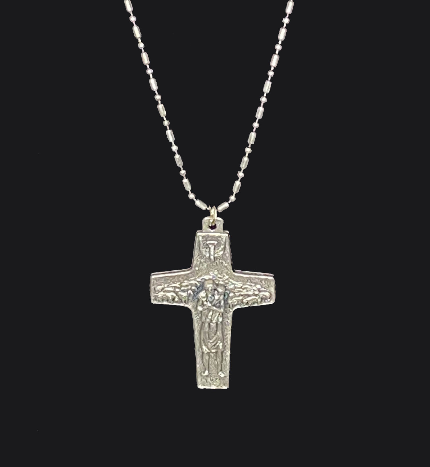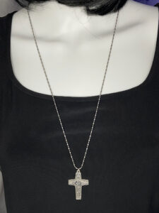 This pre-loved necklace & pendant has 30″ stainless steel ball chain with a lobster clasp. Pendant is 1 5/8″ long and 1″ at widest.